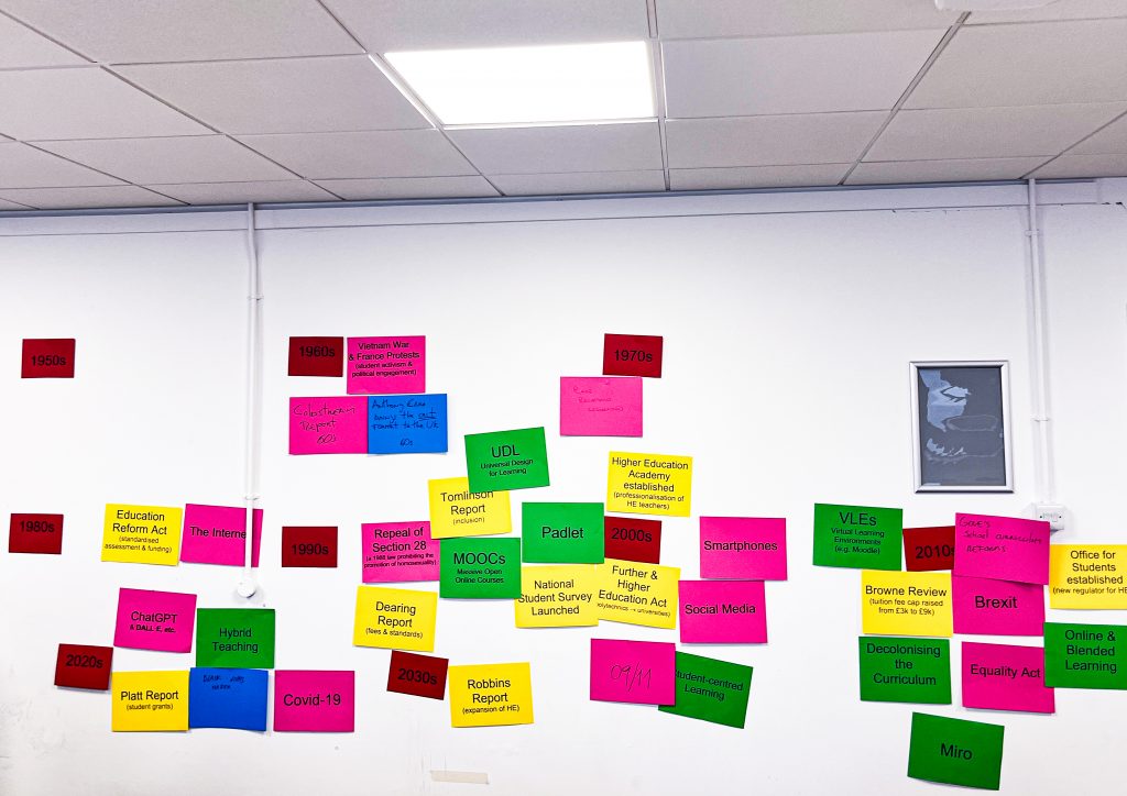 The space seemed quite challenging because of the lack of privacy and proper separation from other classrooms, and in delivering these workshops within this design how do you capture the attention of your students? Were you already prepared to work in a similar space? Besides that, all the students were listening, taking notes and pictures of the slides you were sharing on the screen which I found quite hard to read due to the size of the fonts and the background colour. Would you think it will be better at adopting colours and family fonts and sizes that are more readable (e.g. white colours and sans serif fonts) in particular by students affected by neurodiversity? Notwithstanding, the lack of a super clear presentation was obviated by detailed instructions and guidance printed on 2 A4 papers.